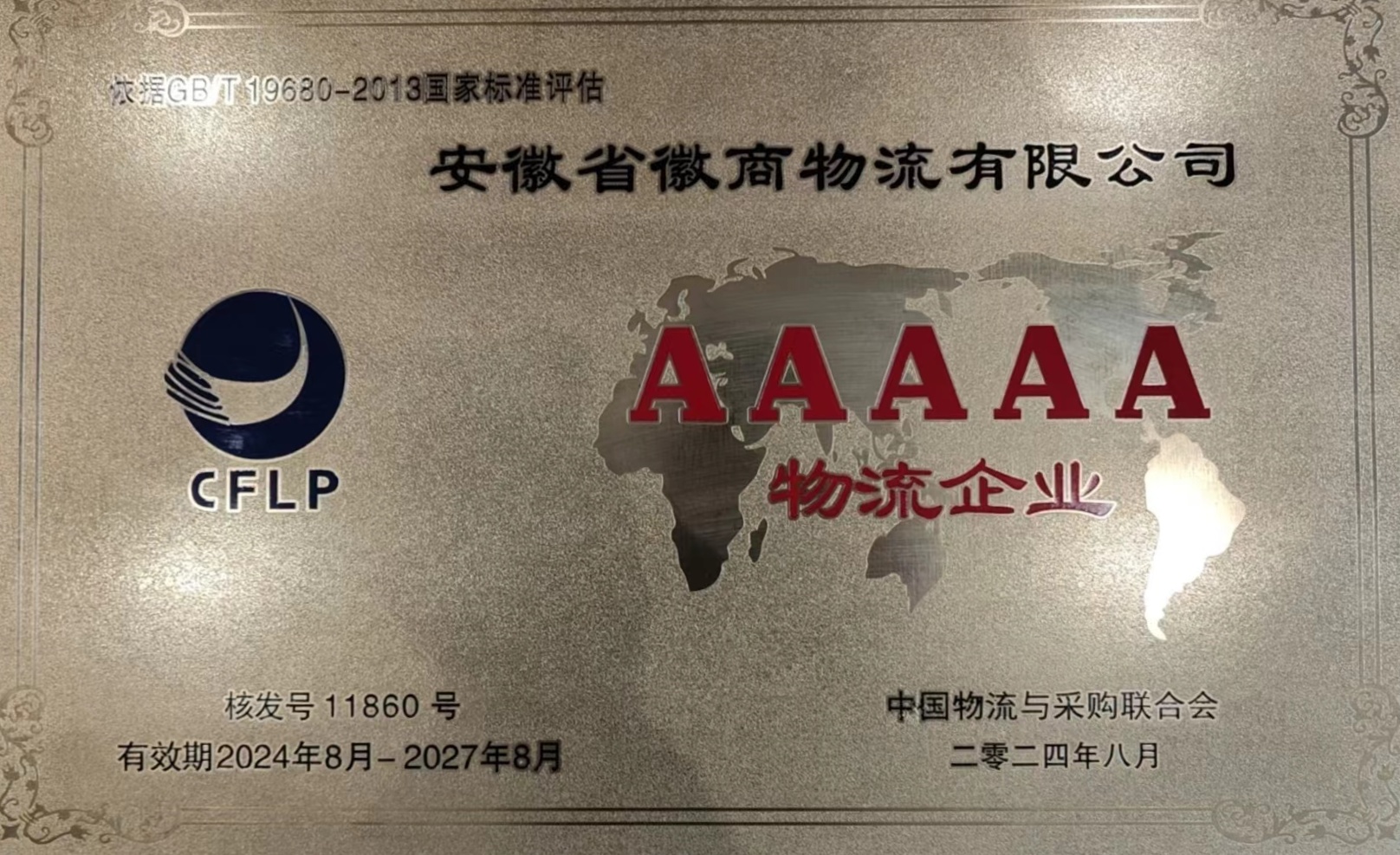 2024年10月11日,38屆物流企業(yè)授牌暨供應(yīng)鏈創(chuàng)新發(fā)展大會(huì)在寧夏銀川召開(kāi)。大會(huì)向獲得本批次A級(jí)物流企業(yè)、擔(dān)保存貨管理及質(zhì)押監(jiān)管企業(yè)、星級(jí)冷鏈物流企業(yè)、網(wǎng)絡(luò)貨運(yùn)平臺(tái)企業(yè)、供應(yīng)鏈服務(wù)企業(yè)的代表頒發(fā)了證書(shū)及牌匾?;丈涛锪鞴緟⒓邮谂拼髸?huì),躋身國(guó)家5A級(jí)物流企業(yè)行列。