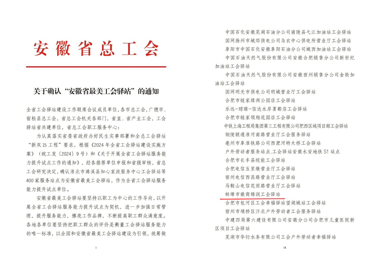 近日,安徽省徽商錦潤(rùn)物流有限公司工會(huì)驛站被安徽省總工會(huì)確認(rèn)為“安徽省最美工會(huì)驛站”稱號(hào)。